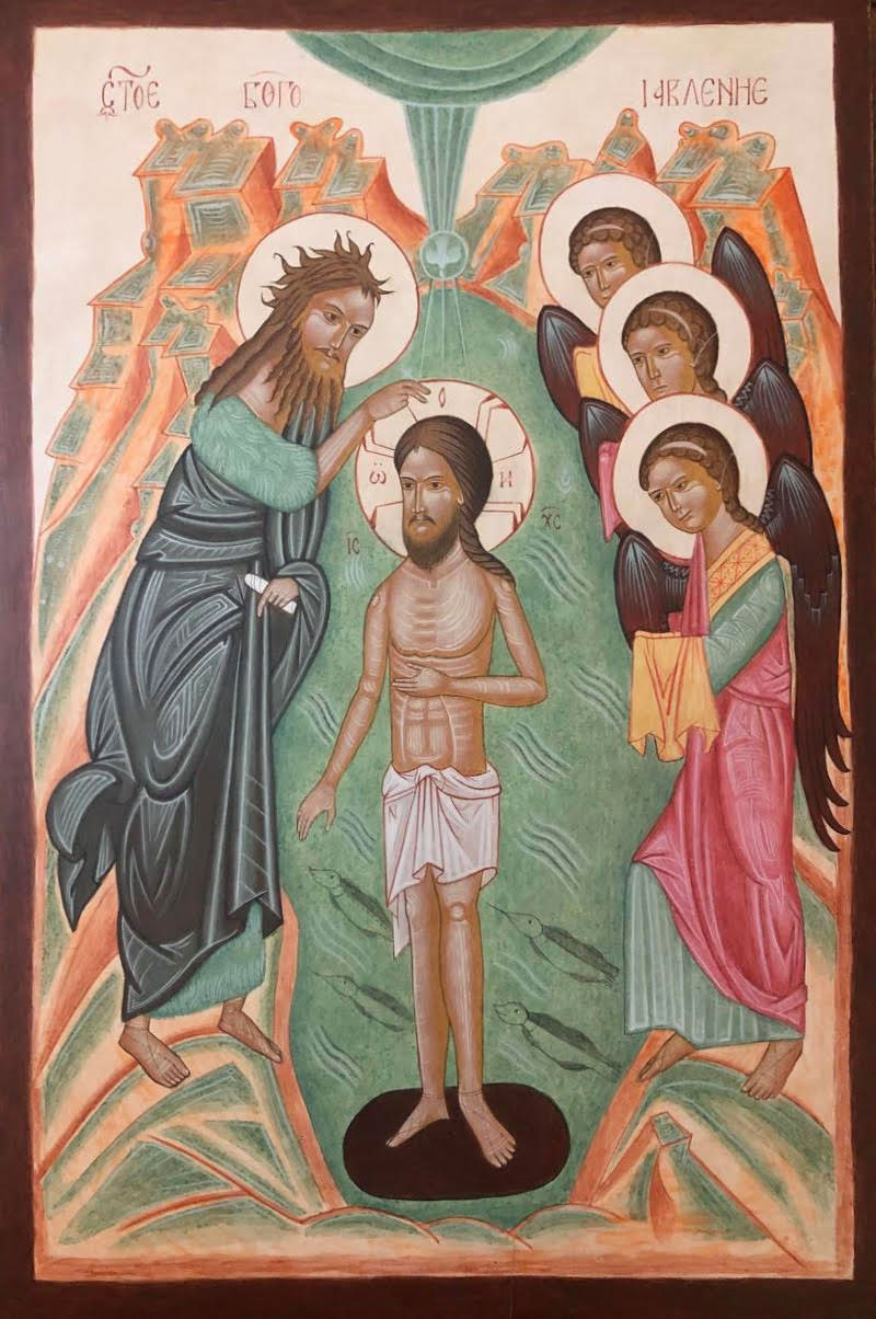 КОЗУРАК Сильвестр — студент стаціонарної програми з іконопису за спеціальністю «Іконописець-богослов» (3 курс) у Школі «Радруж», одночасно завершує шкільну загальноосвітню програму, серйозно займається музикою, співає в церковному хорі. На виставку «І Слово стало тілом» мистець подав ікону «Богоявлення-Хрещення Господнє». Вона є наслідуванням славнозвісного майстра із села Радруж, який вирізняється незвичайним і дуже оригінальним вирішенням кольорових партій, деталей, композицій тих чи інших сюжетів, виконаних у досконалій та витонченій техніці малярства. Прикладом цікавого колористичного рішення, якого не бачимо в інших майстрів, є, зокрема, помаранчеві гірки, написані суриком (мінеральний пігмент). Ці гірки є передусім носієм важливого богословського змісту. Вони візуалізують слова Предтечі: «Я вас хрищу водою на покаяння, а той, хто йде за мною, від мене потужніший…Він вас христитиме Духом Святим і вогнем» (Мт. 3,11).