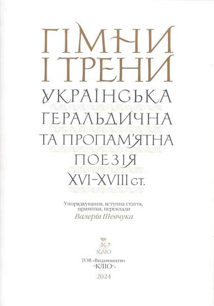 Гімни і трени. Українська геральдична та пропам’ятна поезія XVI–XVIII ст. / упоряд., вступ. ст., прим., пер. Валерія Шевчука; наук. ред. В. О. Курганова. – Київ: ТОВ «Видавництво “Кліо”», 2024. – 500 с., іл.