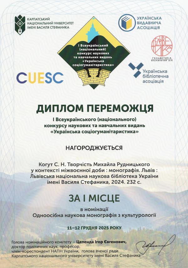 Водночас у номінації «Одноосібна наукова монографія з культурології» першим місцем було відзначено працю кандидатки філологічних наук, в. о. завідувача відділу наукової бібліографії Софії Когут «Творчість Михайла Рудницького у контексті міжвоєнної доби». Монографія репрезентує глибокий культурологічний та літературознавчий аналіз діяльності Михайла Рудницького, інтегрований у широкий контекст європейського та українського інтелектуального життя першої половини ХХ століття. Високий рівень відзначених праць підтверджує значний науковий потенціал установи та її роль у розбудові сучасної української соціогуманітаристики. Щиро вітаємо переможців та бажаємо їм подальших успіхів у науковій діяльності, нових дослідницьких здобутків та успішної реалізації майбутніх проєктів.