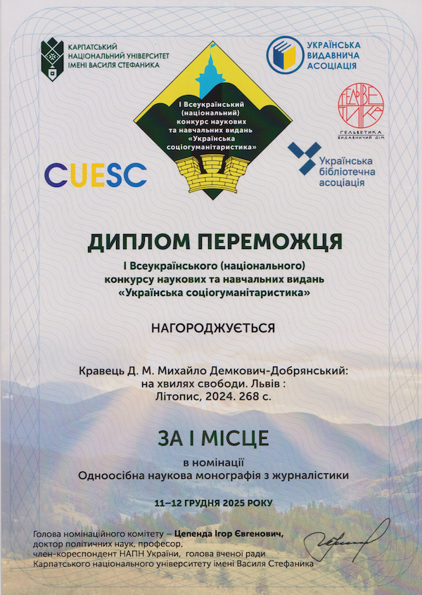 Експертне журі високо оцінило науковий доробок співробітників ЛННБ України ім. В. Стефаника, присудивши перемоги у профільних категоріях. Зокрема, у номінації «Одноосібна наукова монографія з журналістики» перше місце посіло дослідження кандидата історичних наук, старшого наукового співробітника Данила Кравця «Михайло Демкович-Добрянський: на хвилях свободи». У роботі здійснено комплексний історико-біографічний аналіз постаті видатного публіциста та громадського діяча, а також досліджено його внесок у розвиток українського медіапростору та національної ідентичності.