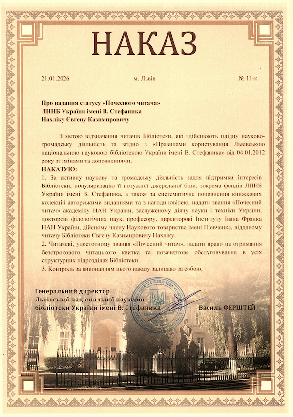 Важливою сторінкою біографії науковця є його багаторічна співпраця з Львівською національною науковою бібліотекою України імені В. Стефаника. З нагоди 70-річчя, а також за активну наукову й громадську діяльність на підтримку інтересів Бібліотеки, популяризацію її потужної джерельної бази та систематичне поповнення книжкових колекцій авторськими виданнями академікові Євгенові Нахліку присвоєне звання «Почесний читач».