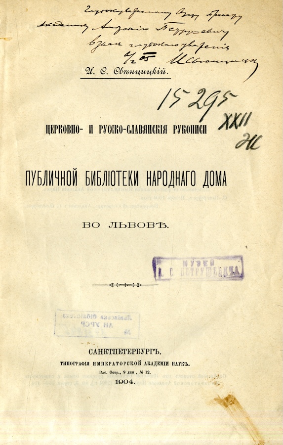 Церковно - и русско-славянскія рукописи Публичной Библіотеки Народнаго Дома во Львовҍ. С.-Пб:, 1904.