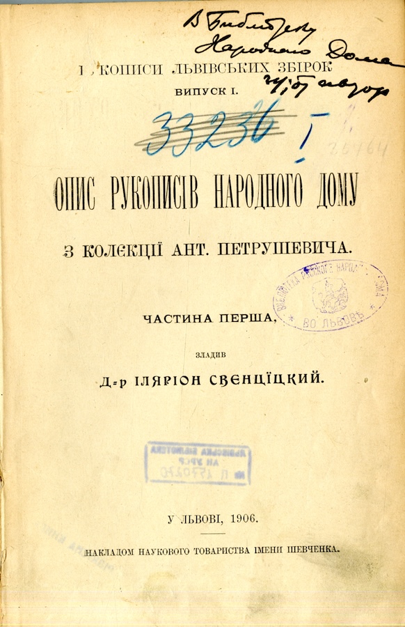 Опис рукописів Народного Дому з колєкції Ант. Петрушевича: [У 3 ч.]. Українсько-Руський Архив.Т.1. Львів, 1906. Ч. 1.
