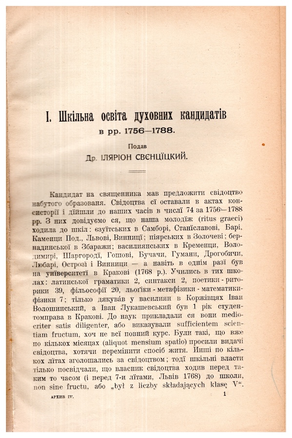 Шкільна освіта духовних кандидатів в рр. 1756 - 1788. Українсько-руський архив: Матеріяли до історії галицько-руського шкільництва XVIII і ХІХ вв. Львів, 1909. Т. 4.
