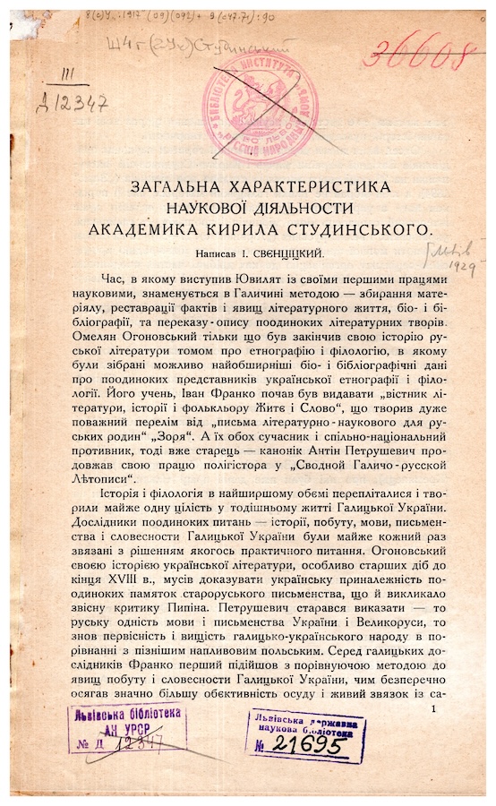 Загальна характеристика наукової діяльности академика Кирила Студинського. Львів, 1928.