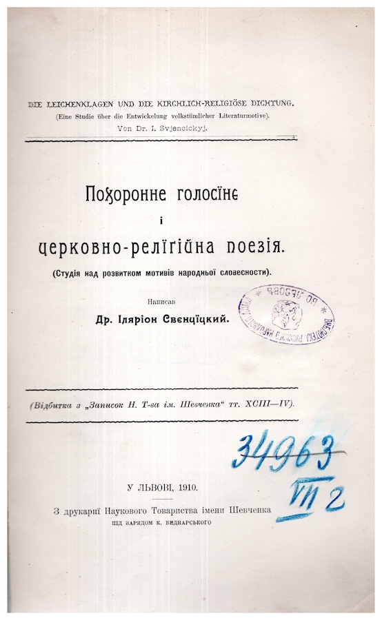 Похоронне голосіння і церковно-релігійна поезія: (Студія над розвитком мотивів народної словесності). Львів, 1910. (Відбитка).