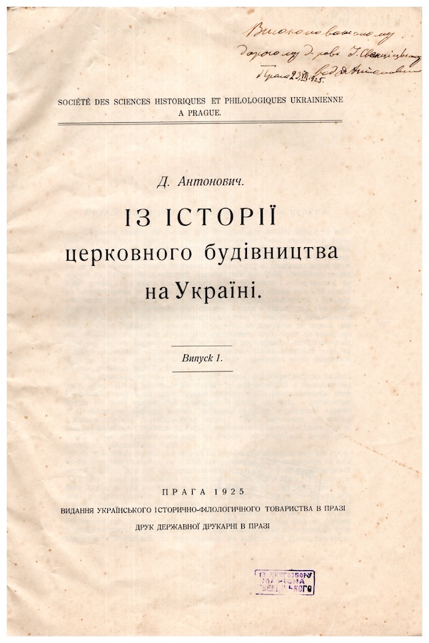 Антонович Дмитро (1877 - 1945) – громадсько-політичний діяч, історик мистецтва і театру. Діяч Центральної ради, за Директорії – голова української дипломатичної місії в Римі. Антонович Д. Із історії церковного будівництва на Україні / Українське історично-філологічного товариство в Празі. Прага, 1925. Вип. 1.