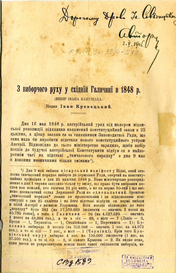 Кревецький Іван (1883 – 1940) - український історик, бібліограф, громадський діяч і журналіст, дійсний член і керівник бібліотеки НТШ. Кревецький І. З виборчого руху у східнїй Галичинї в 1848 р. (Вибір Івана Капущака). [Львів], [1905].