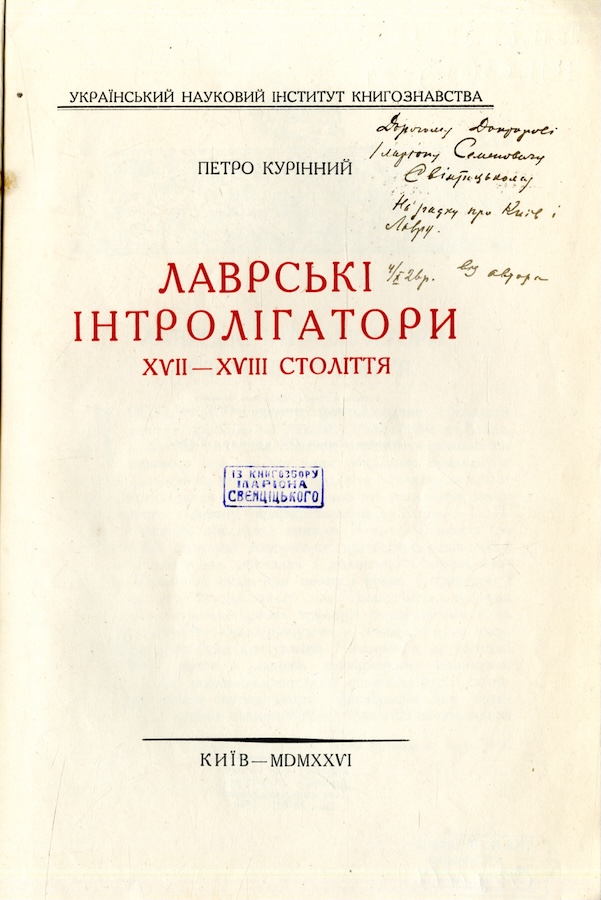 Курінний Петро Петрович (1894 - 1972) - історик, археолог, етнограф, музеєзнавець, організатор пам’яткоохоронної справи. Курінний П. Лаврські інтролігатори XVII–XVIII століття. Київ, 1926.