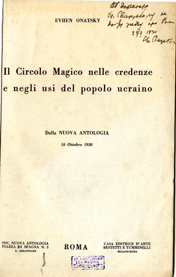 Онацький Євген (1894 – 1979) - український націоналіст, енциклопедист, журналіст і науковець, громадський діяч, член Української Центральної Ради. Onatsky E. Il Circolo Magico nelle credenze e negli usi del popolo ucraino. Roma, 1930. (Dalla Nuova antologia ; 16 Ottobre 1930).