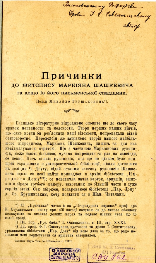 Тершаковець Михайло (1883 – 1978) - історик літератури, доктор, педагог, почесний член НТШ. Тершаковець М. Причинки до життєпису Маркіяна Шашкевича та дещо із його письменської спадщини. [Львів], [1912].( Відбитка).