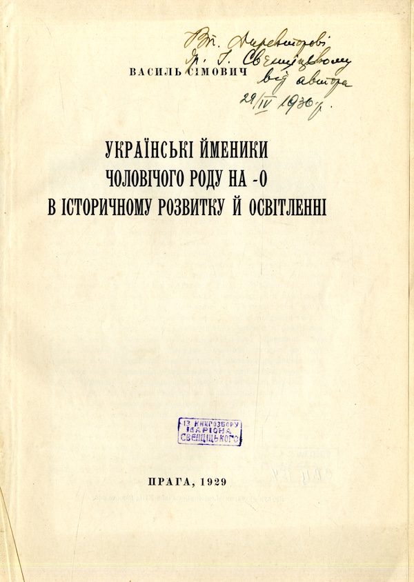 Сімович Василь (1880 – 1944) – визначний український мовознавець, культурний діяч, професор Українського Високого Педагогічного Інституту ім. Драгоманова у Празі, дійсний член НТШ, співробітник СВУ. Сімович В. Українські іменники чоловічого роду на –о в історичному розвитку й освітленні. Прага, 1929. (Відбитка).