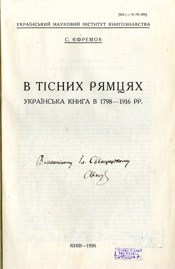 Єфремов Сергій (1876 - 1939) - громадсько-політичний діяч, літературний критик, історик української літератури, академік ВУАН, дійсний член НТШ. Єфремов С. В тісних рямцях. Українська книга в 1798-1916 рр. Київ, 1926.