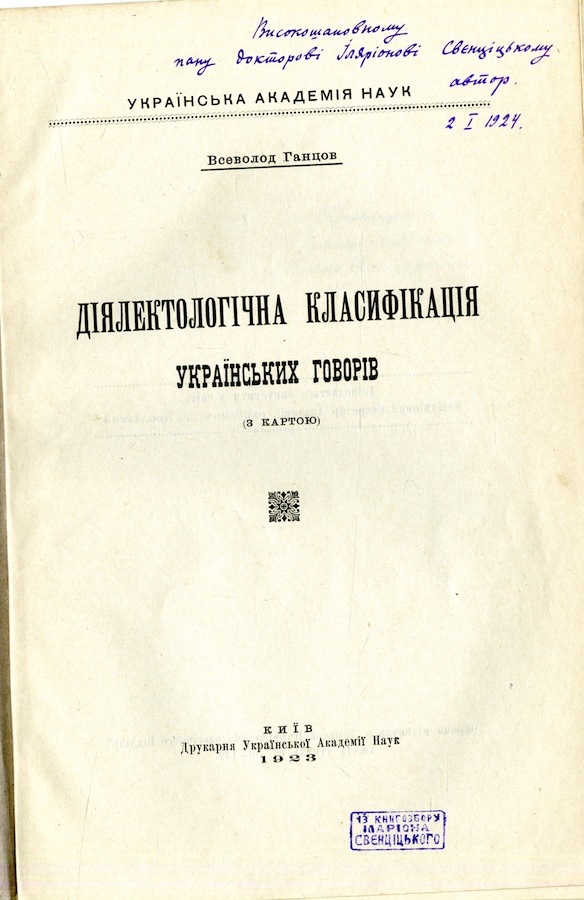 Ганцов Всеволод (1892 – 1979) – видатний український мовознавець, лексикограф, науковий співробітник ВУАН у Києві. Ганцов В. Діялектологічна класифікація українських говорів. Київ, 1923. (Відбитка).