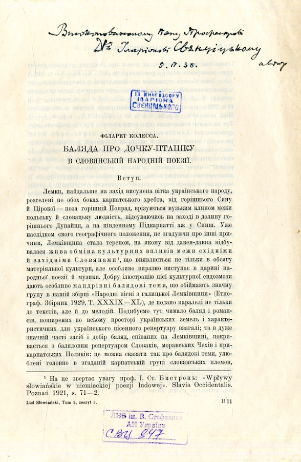 Колесса Філарет (1871 – 1947) - етнограф, фольклорист, композитор, музикознавець і літературознавець. Основоположник українського етнографічного музикознавства. Колесса Ф. Баляда про дочку-пташку в слов’янській народній поезії. Kraków, 1937. (Відбитка).
