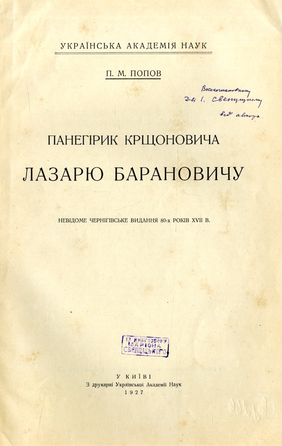 Попов Павло (1890 - 1971) - літературознавець, мистецтвознавець, фольклорист, книгознавець. Попов П. М. Панегірик Крщоновича Лазарю Барановичу: невідоме Чернігівське видання 80-х років XVII в. Київ, 1927. (Відбитка).