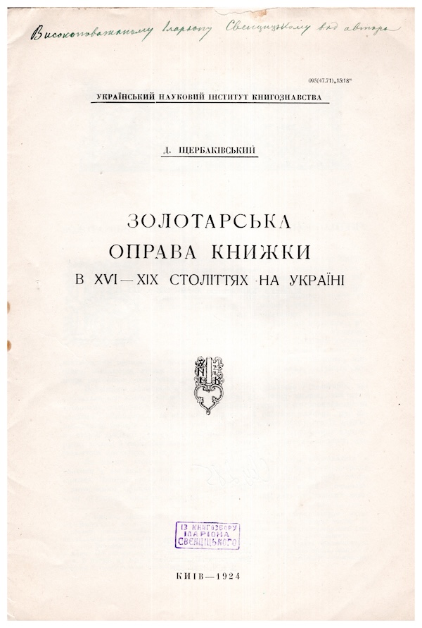 Щербаківський Данило (1877 - 1927) - український етнограф, археолог, музейний діяч, дослідник українського народного мистецтва, дійсний член НТШ. Щербаківський Д. Золотарська оправа книжки в XVI - XIX століттях на Україні. Київ, 1924. (Відбитка).