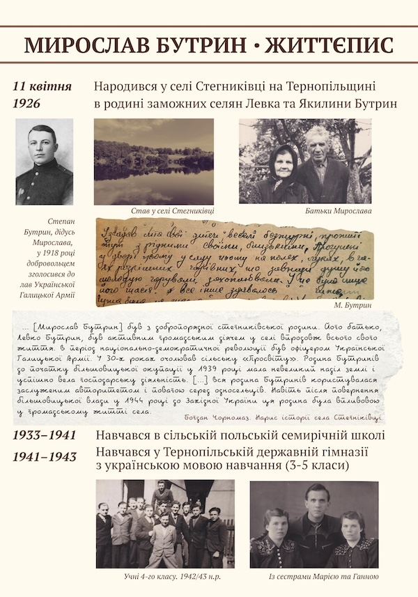 Народився Мирослав Бутрин 11 квітня 1926 року в селі Стегниківці Тернопільського району в родині заможних селян Левка та Якилини Бутрин. Його земляк, український історик Богдан Чорномаз, у книжці «Нарис історії села Стегниківці», представленій на виставці, згадує про спілкування з паном Мирославом і наголошує, що вся родина Бутринів користувалася заслуженим авторитетом і повагою серед односельців. Батько вченого був активним громадським діячем, очолював сільську «Просвіту». Дідусь Степан Бутрин пішов добровольцем в Українську Галицьку Армію. Його фотографію на початку 1990-х М. Бутрин передав до редакції «Літопису Червоної Калини», де її невдовзі оприлюднили (№ 7/9 за 1993 рік).