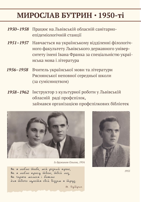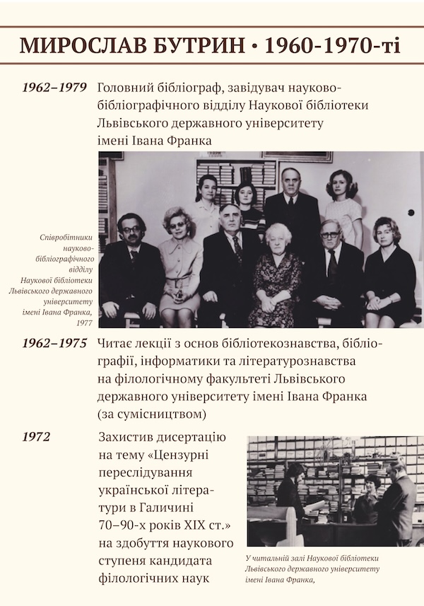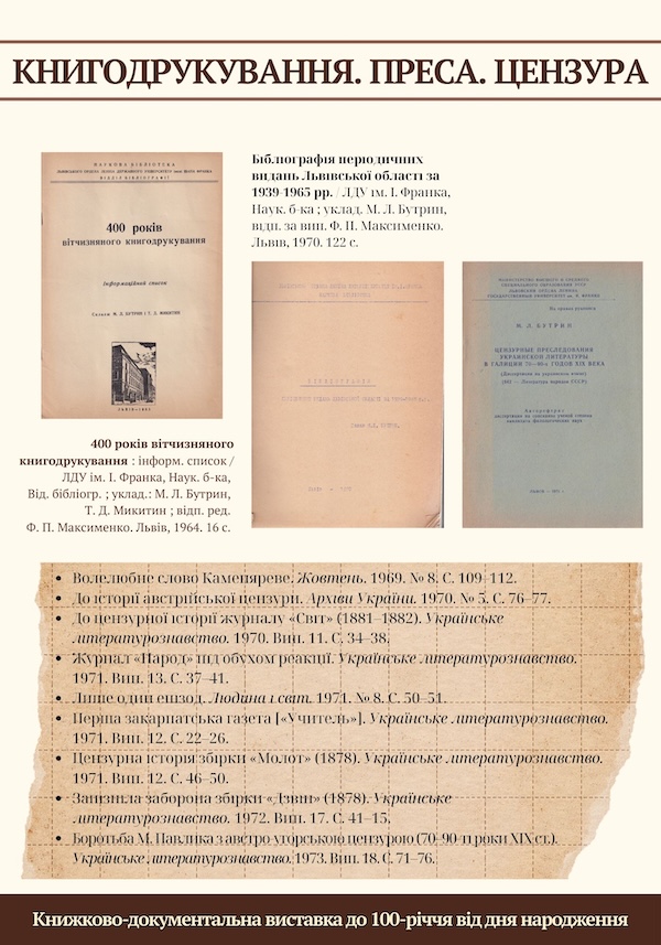 Упродовж 1951–1957 років М. Бутрин навчається у Львівському державному університеті на філологічному факультеті. Від 1962 року працює в Науковій бібліотеці цього університету, де обіймаючи посаду головного бібліографа, а від 1976 року – завідувача науково-бібліографічного відділу. У 1960-х роках укладає персональні бібліографічні списки про Олександра Серафимовича, Антона Макаренка, Михайла Коцюбинського та Максима Рильського; згодом збирає бібліографічні джерела до вивчення життя і творчості Івана Нечуя-Левицького, Леоніда Глібова, Юрія Федьковича, Василя Щурата та Марка Черемшину; публікує розвідки про Леся Мартовича, Агатангела Кримського, Наталію Кобринську, Теодора Микитина; готує два видання пам’ятки «Бібліографічні посібники з української літератури і мови» (1964, 1971) та ґрунтовний покажчик «Мова і стиль українських письменників» (1966), експонований на виставці. Окреме місце у доробку вченого посідають укладені у співавторстві з Віталієм Кутиком довідники про письменників – лауреатів тогочасних державних премій (1980, 1982).