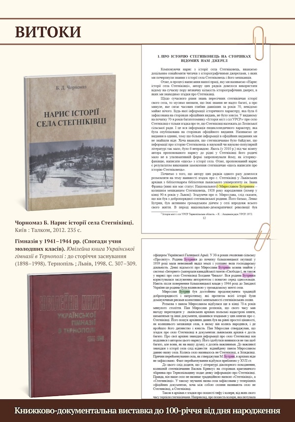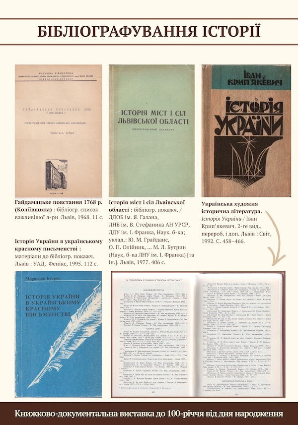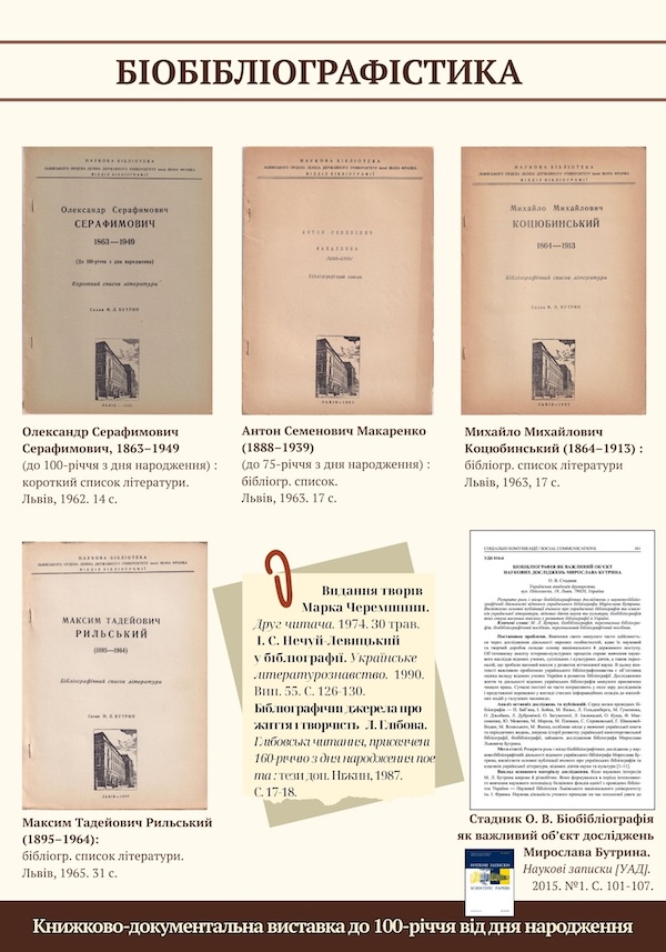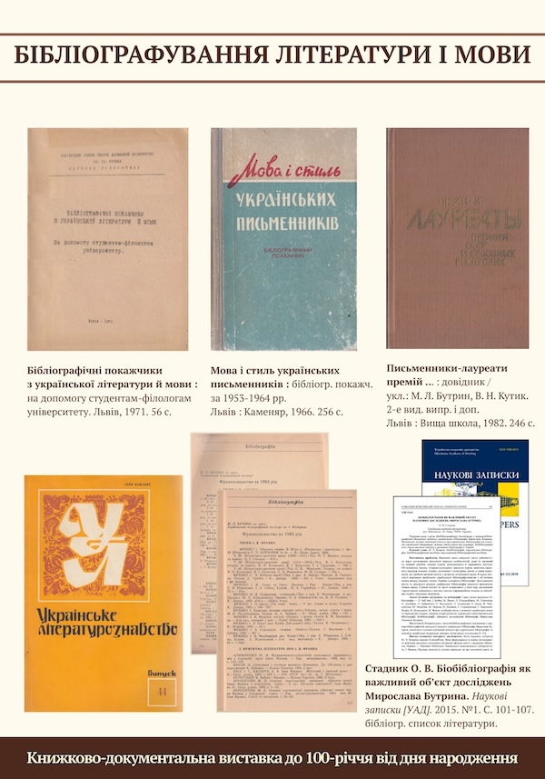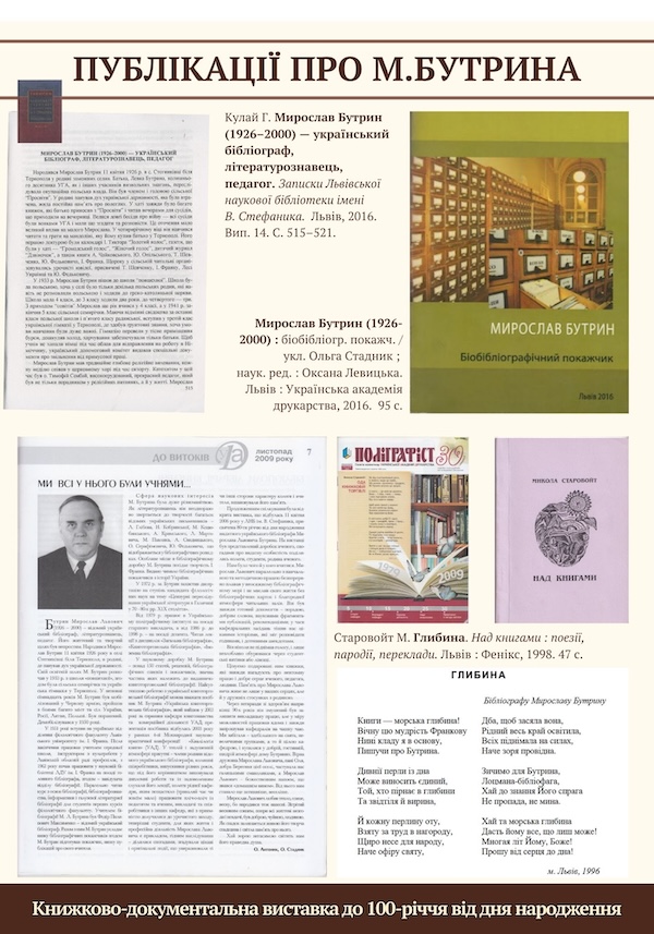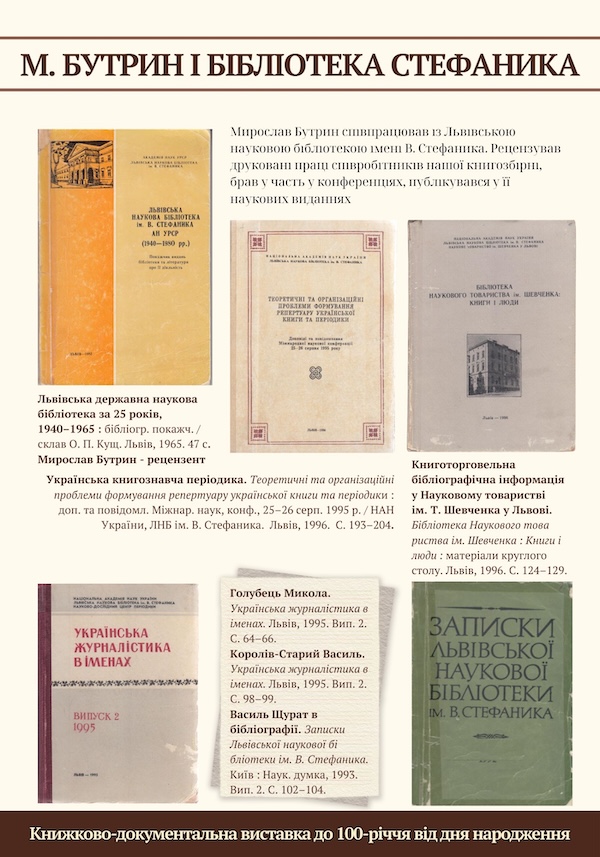 До 100-річчя від дня народження Мирослава Бутрина у читальному залі відділу бібліотекознавства розгорнуто книжково-документальну виставку, що всебічно репрезентує життєвий шлях, бібліографічну діяльність і науковий доробок визначного українського бібліографа і бібліографознавця.