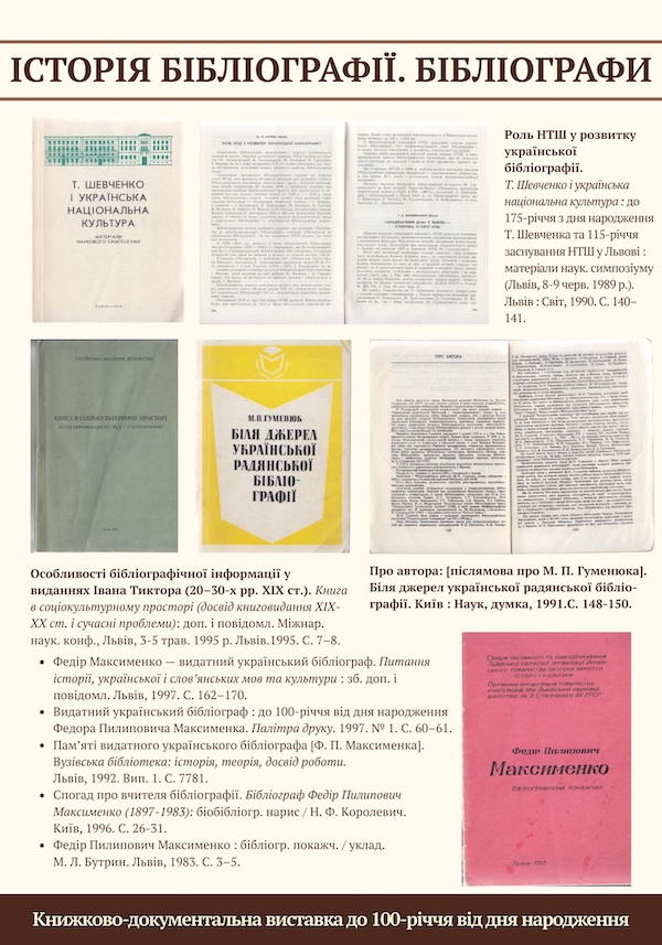 В експозиції також широко репрезентовано праці з історії бібліографії, зокрема книготорговельної. Представлено публікації про бібліографічну діяльність Наукового товариства імені Т. Шевченка, зокрема: «Книготорговельна бібліографічна інформація у Науковому товаристві ім. Т. Шевченка у Львові», оприлюднена у матеріалах круглого столу «Бібліотека Наукового товариства імені Шевченка: книги і люди» (Львів, 1996); «Роль НТШ у розвитку української бібліографії», надрукована в матеріалах наукового симпозіуму «Т. Шевченко і українська національна культура» (Львів: Світ, 1990); «“Матеріали до української бібліографії” в бібліографічній діяльності НТШ» у продовжуваному збірнику «Поліграфія і видавнича справа» (1997. Вип. 32). Низка статей присвячена життю і діяльності українських бібліографів, передусім його вчителя – Федора Максименка.