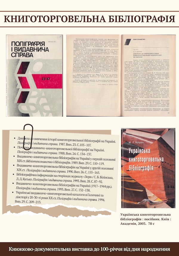 Важливе місце у науковій спадщині М. Бутрина і на виставці посідають праці, в яких комплексно висвітлено генезу й етапи її розвитку від першої половини ХІХ до середини ХХ століття, проаналізовано джерельну базу, типологічні особливості бібліографічної інформації та роль каталогів і періодики в розвитку книговидання і книгопоширення. Від 1987 року вчений систематично публікував статті про видавничо-книготорговельну бібліографію на сторінках «Поліграфії і видавничої справи». Уже після смерті автора (29 травня 2000 року) колеги з кафедри книгознавства і комерційної діяльності Української академії друкарства сприяли виходу у світ навчального посібника «Українська книготорговельна бібліографія» (Київ, 2003).