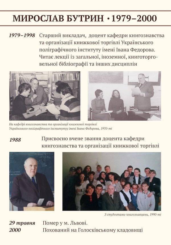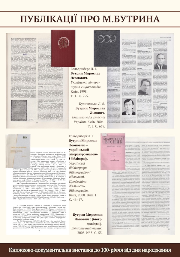 Завершують експозицію матеріали про відомого бібліографа і науковця – статті в енциклопедіях і довідниках, наукові та науково-популярні публікації в періодичних і продовжуваних виданнях, поетичні тексти, а саме – вірш Миколи Старовойта з промовистою назвою «Глибина». Вагомим підсумком осмислення життєвого шляху і наукової спадщини М. Бутрина стало видання біобібліографічного покажчика, що побачив світ до його 90-річчя в Українській академії друкарства (укладач – Ольга Стадник, науковий редактор – Оксана Левицька). У ньому всебічно висвітлено життєпис і науковий доробок ученого, який упродовж 1979–1998 років працював на кафедрі книгознавства та організації книжкової торгівлі, а також подано спогади його учнів і колег.