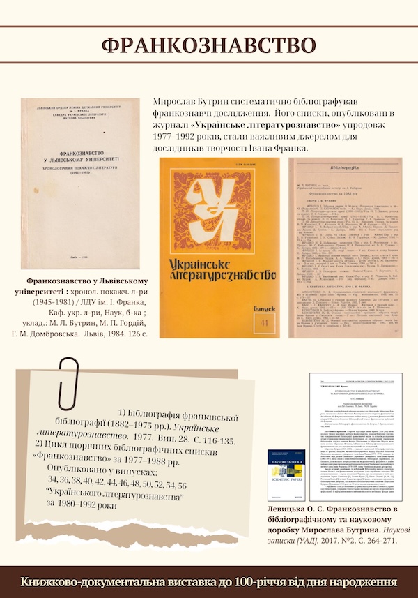 Окремий розділ експозиції присвячено франкознавчій бібліографії — напряму, якому М. Бутрин віддав багато років наполегливої праці, починаючи від середини 1970-х років. Учений здійснив ґрунтовне дослідження франківської метабібліографії за 1882–1975 роки і підготував цикл бібліографічних списків «Франкознавство за … рік» (1977–1988), опублікованих у журналі «Українське літературознавство». Ці публікації стали своєрідним літописом франкознавчих студій: у них зосереджено відомості про нові видання творів класика та матеріали про нього, систематизовані за тематичними розділами — від критичної літератури до художніх інтерпретацій і хронікальних повідомлень.
